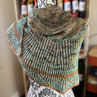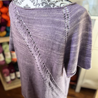 Hier siehst du den Stepping Stones Shawl von Julie Knits In Paris. Dieses Design eignet sich auch für Strick-Anfänger*innen und begleitet dich Schritt für Schritt durch die Welt des Brioche-Strickens.